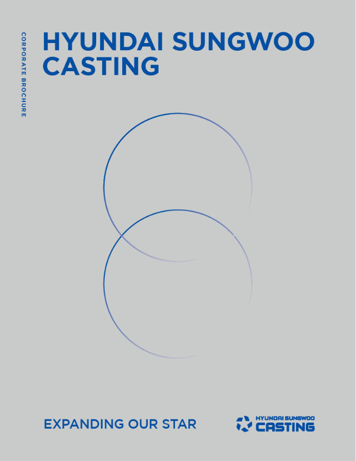 그룹의 무한한 ‘도전정신’을 운동성과 방향성을 가진 ‘인피니티 서클’로 시각화하여, 현대성우의 전 사업 영역을 총괄하는 홀딩스를 ‘허브’로, 함께 도전하는 캐스팅사업을 ‘시너지’로 , 한계를 뛰어넘는 ‘에너지’로 배터리사업을 표현했습니다. 브로슈어의 패키지는 그룹의 모태가 된 캐스팅사업을 상징하는 알루미늄스틸로 제작하여 그룹의 역사와 미래의 연결성을 담았습니다. 사업의 특징을 정확히 보여주는 현장감 있는 사진과 함께 ‘인피니티 서클’을 브로슈어 전체에 통일적으로 사용한 디자인 컨셉을 통해 그룹의 무한한 ‘도전정신’을 경험하게 합니다.